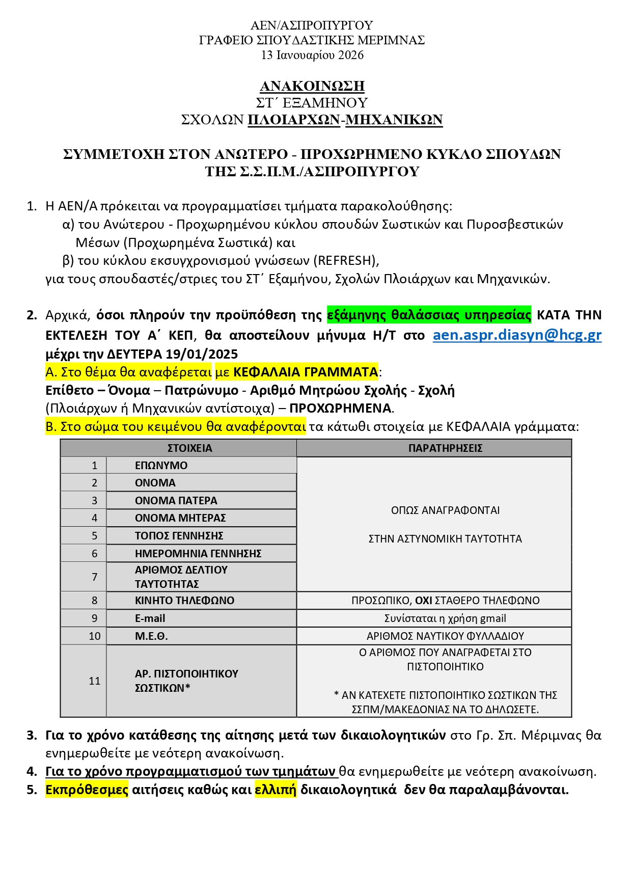 | ΣΥΜΜΕΤΟΧΗ ΣΤΟΝ ΑΝΩΤΕΡΟ - ΠΡΟΧΩΡΗΜΕΝΟ ΚΥΚΛΟ ΣΠΟΥΔΩΝ ΤΗΣ Σ.Σ.Π.Μ./ΑΣΠΡΟΠΥΡΓΟΥ ΣΤ΄ ΕΞΑΜΗΝΟ ΑΚ. ΕΤΟΥΣ 2025-2026 | 887.33 KB | 13-01-2026 |
