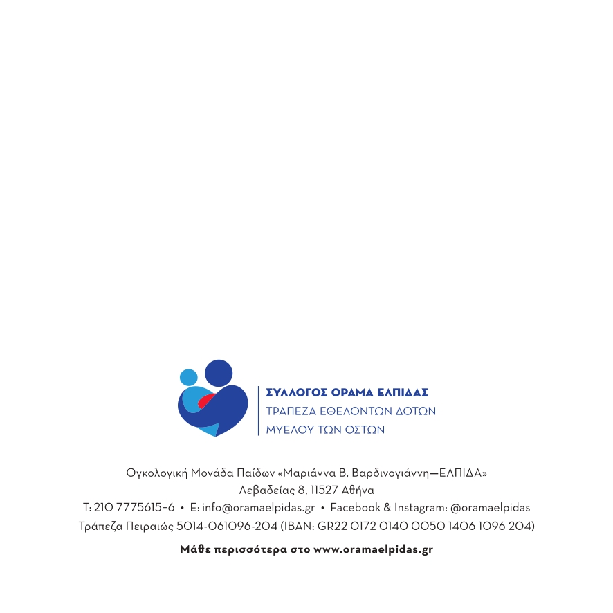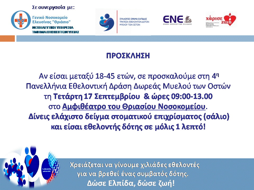 | ΠΑΝΕΛΛΗΝΙΑ ΕΘΕΛΟΝΤΙΚΗ ΔΡΑΣΗ ΔΩΡΕΑΣ ΜΥΕΛΟΥ ΤΩΝ ΟΣΤΩΝ - ΘΡΙΑΣΙΟ ΝΟΣΟΚΟΜΕΙΟ | 93.16 KB | 12-09-2025 |